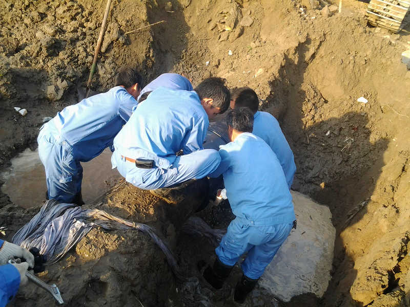 接到報修后,濱海供水公司搶修人員迅速趕赴現場查勘,確定搶修方案,并及時向相關企業發布搶修停水通告。搶修人員當即對設備關閘停水,同時,采取球墨哈夫節封堵技術處理漏點,經過